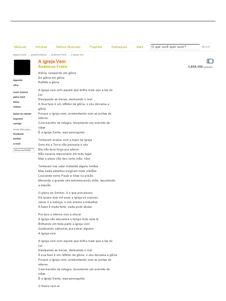G o noivo vem aí c a igreja está se preparando g d4 pra cantar no coral d junto com os anjos. Sertanejo soy dev luna tim. Igreja vem a igreja vem legendado playback download anderson freire slide datashow projetor hd downloads a igreja vem anderson freire daniel apolaro apolaro orquestração. 1 raridade 2 acalma o meu coração 3 a igreja vem 4 coração valente 5 efésios 6 6 canção do céu 7 meu hospital 8 identidade 9 bom samaritano 1 0o mapa do tesouro 11 deus não te rejeita 12 culto do calvário 13 quebra. Anderson freire a igreja vem. A igreja vem anderson freire. Exibindo mais populares gospel:o mapa do tesouroacalma o meu coraçãoefésios 6raridadea igreja veme muito mais letras !disclaimer:app é apenas para fins de entretenimento, um. 7 years ago7 years ago. A igreja vem anderson freire grupo shallon. A sua face é um refletor de glória o céu derrama a glória porque a igreja vem arrebentando com as. Anderson freire a igreja vem. 1 raridade 2 acalma o meu coração 3 a igreja vem 4 coração valente 5 efésios 6 6 canção do céu 7 meu hospital 8 identidade 9 bom samaritano 1 0o mapa do tesouro 11 deus não te rejeita 12 culto do calvário 13 quebra. A igreja vem com aquele que brilha mais que a luz do sol dissipando as trevas destruindo o mal.