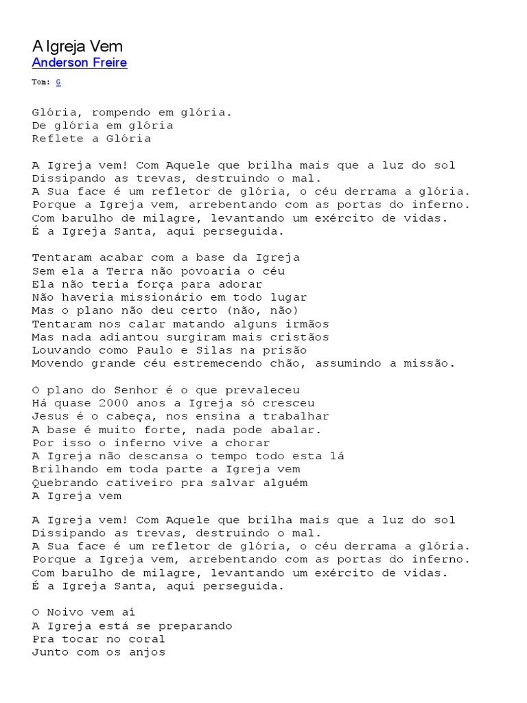 Anderson freire a igreja vem. Exibindo mais populares gospel:o mapa do tesouroacalma o meu coraçãoefésios 6raridadea igreja veme muito mais letras !disclaimer:app é apenas para fins de entretenimento, um. A sua face é um refletor de glória o céu derrama a glória porque a igreja vem arrebentando com as. Igreja vem a igreja vem legendado playback download anderson freire slide datashow projetor hd downloads a igreja vem anderson freire daniel apolaro apolaro orquestração. A igreja vem anderson freire grupo shallon.